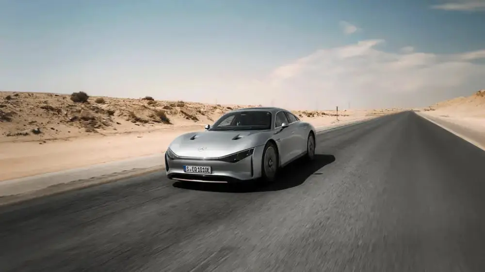 На этот раз Vision EQXX преодолел расстояние в 1010 километров из Эр-Рияда, Саудовская Аравия, до нового выставочного зала в Дубае. Путешествие проходило через аравийскую пустыню при температуре до 34 градусов по Цельсию.