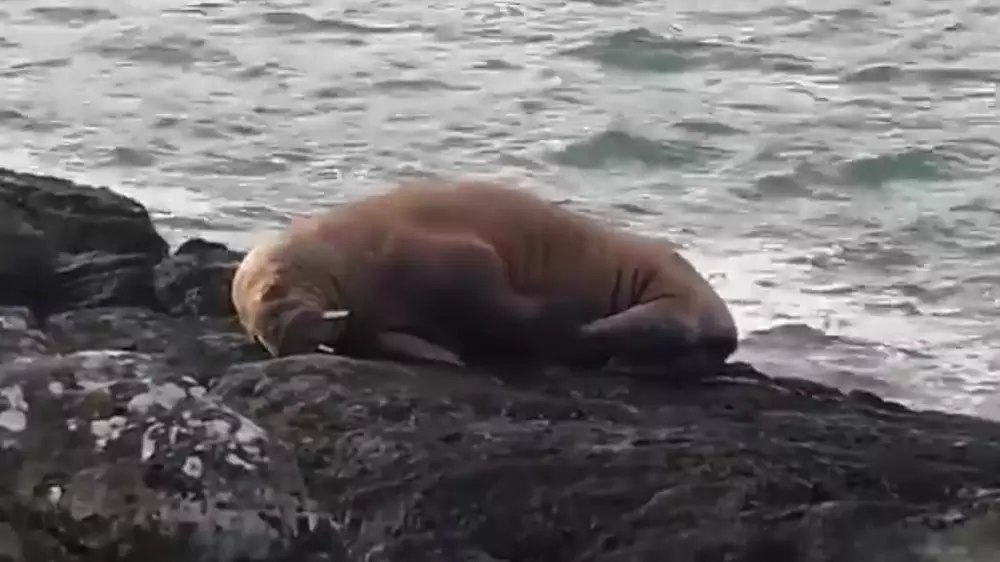 Интересное наблюдение сделал местный житель Алан Хулихан, который заснял моржа на берегу.