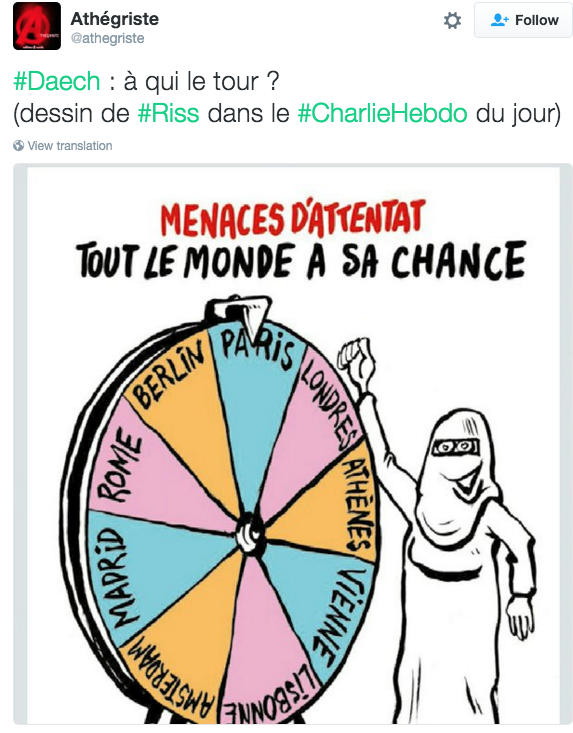 Отметим, что незадолго до взрывов в Брюсселе Charlie Hebdo опубликовал "пророческую" карикатуру. На рисунке было изображено "колесо Фортуны", на котором написаны названия европейских столиц. Стрелка замерла на секторе "Париж", однако женщина на картинке уже готовится повернуть барабан. Следующие сектора: Лондон, Афины, Вена, Лиссабон, Амстердам, Мадрид, Рим и Берлин. Подпись под карикатурой гласит: "Угроза теракта: шанс есть у всего мира".