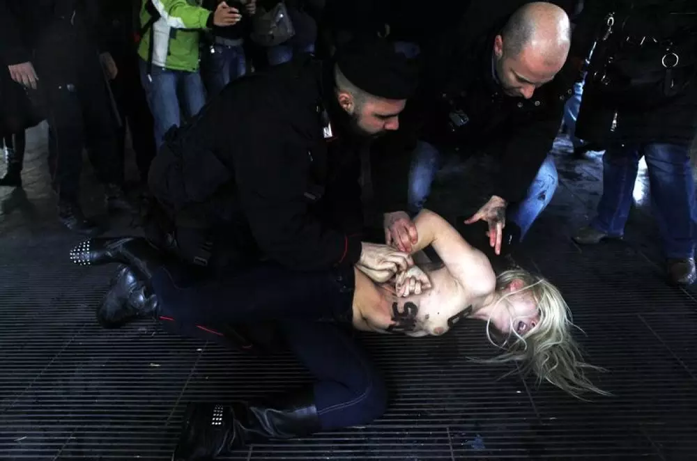 На спинах девушек был написан лозунг "Баста, Берлускони". Инна Шевченко, Оксана Шачко и Ельвир Дювель-Шарлес были сразу же задержаны полицией и выведены на улицу. По данным сайта движения, местонахождение задержанных в настоящий момент неизвестно.