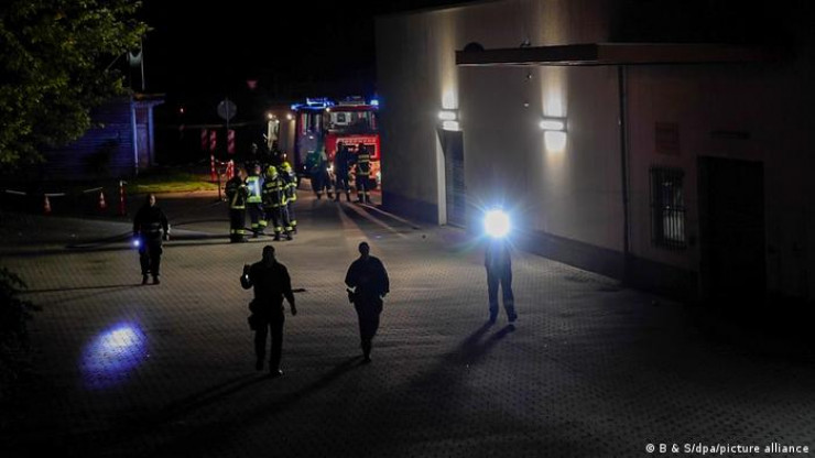 Немецкая полиция в настоящее время разыскивает подозреваемых в поджоге. В последний раз троицу видели убегающей с места происшествия на красном автомобиле.