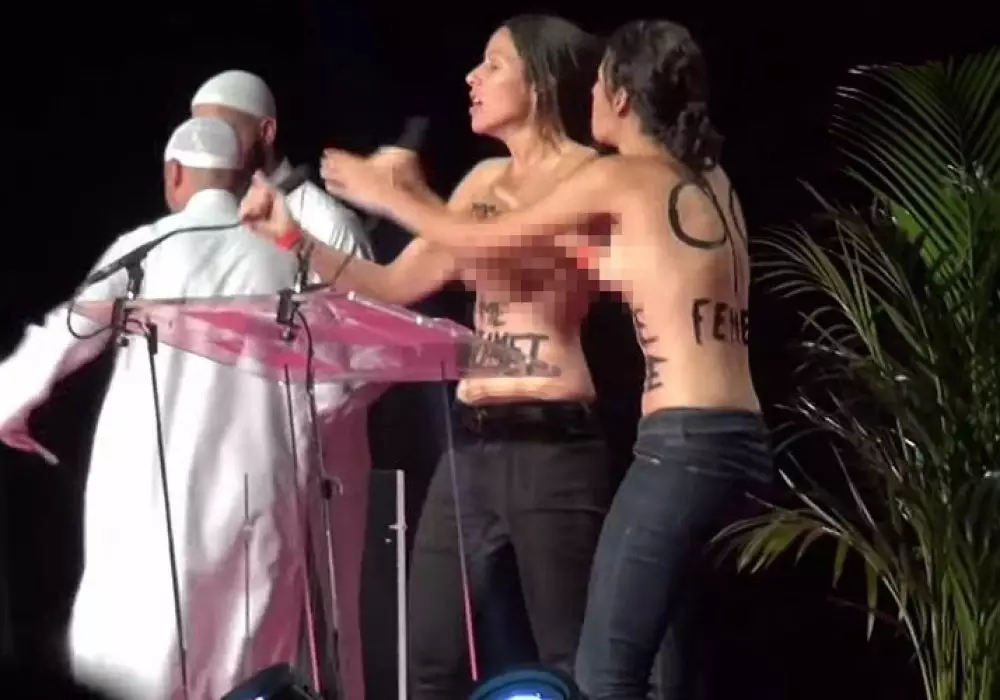 Две девушки залезли на сцену и сбросили с себя одежду во время лекции мусульманского проповедника Надера Абу Анаса о праве бить своих жен. Полуголые активистки сумели завладеть микрофоном и начали выкрикивать лозунги на французском и арабском языках.
