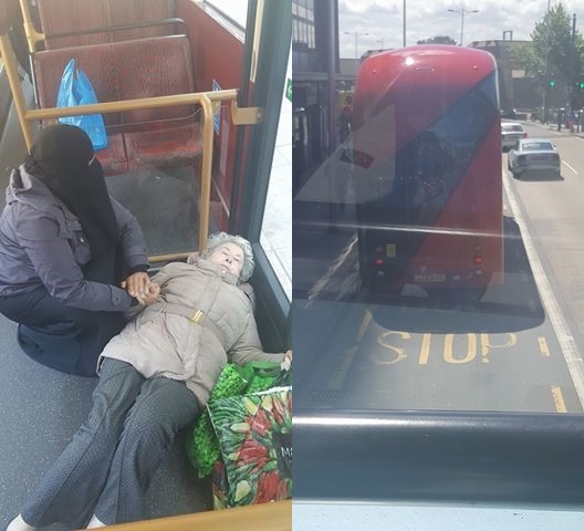 Фотография неизвестной мусульманской женщины, пришедшей на помощь пожилой леди в автобусе Лондона, вызвала широкий отклик у британцев. Снимок опубликовал на своей странице в Facebook житель британской столицы Hamza O Bakri.