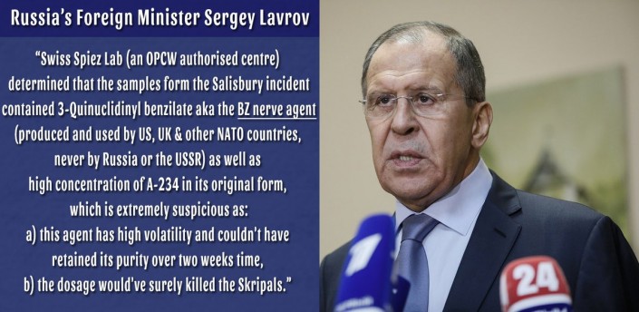 14 апреля глава МИД России Сергей Лавров заявил, что ОЗХО в итоговом докладе не учла выводы швейцарских экспертов, изучивших "дело Скрипаля". По его словам, эксперты выявили признаки того, что в отравлении могло использоваться вещество BZ.