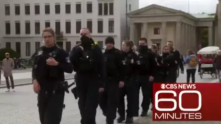 Канал показал, как Навальный за руку с женой Юлией прогуливается возле Бранденбургских ворот в Берлине. Его сопровождают корреспондент CBS Лесли Стол и трое мужчин в гражданской одежде, а на некотором удалении колонной следуют не менее девяти человек в полицейской форме.