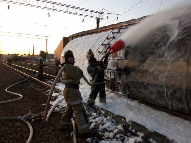 В результате происшествия произошел разлив нефтепродуктов с последующим загоранием. Общая площадь, охваченная огнем, составила 600 квадратных метров. Повреждено 75 метров железнодорожного полотна", - говорится в сообщении.