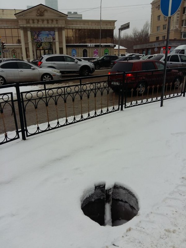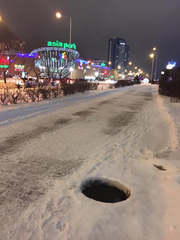 В той же группе другой пользователь разместил фотографии с открытым канализационным колодцем на левобережье Астаны, в районе ТРЦ "Asia Park".