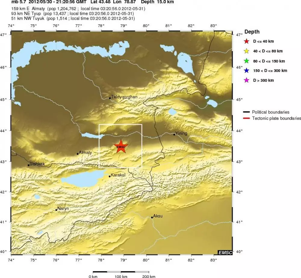 В 148 километрах к востоку от Алматы произошло землетрясение магнитудой 5,7, передает корреспондент Tengrinews.kz со ссылкой на Геологическую службу США. Подземные толчки зафиксированы 31 мая в 03.20 по времени Астаны. Эпицентр землетрясения находился на глубине 25 километров в 186 километрах к югу от Талдыкоргана и 54 километрах к северо-западу от села Кеген. По данным казахстанского Центра сбора и обработки специальной сейсмической информации, в Алматы землетрясение ощущалось с интенсивностью четыре балла. Отметим, что ранее прогнозная комиссия ТОО "Институт сейсмологии", ГУ "СОМЭ КН МОН РК", НПК "Прогноз" МЧС РК, составила сейсмопрогноз на период с 31 мая по 6 июня. Согласно прогнозу на территории Алматинского прогностического полигона землетрясения с интенсивностью более семи баллов по сейсмической шкале MSK-64 не ожидаются.