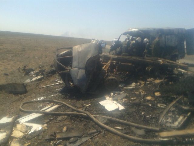 В результате столкновения транспортные средства загорелись, на месте пожара были обнаружили 14 сгоревших тел. Среди погибших на месте оказались водитель автомашины "Газель" и 13 пассажиров микроавтобуса Mercedes-Benz Sprinter (трое из них - дети), сообщает пресс-служба ведомства.