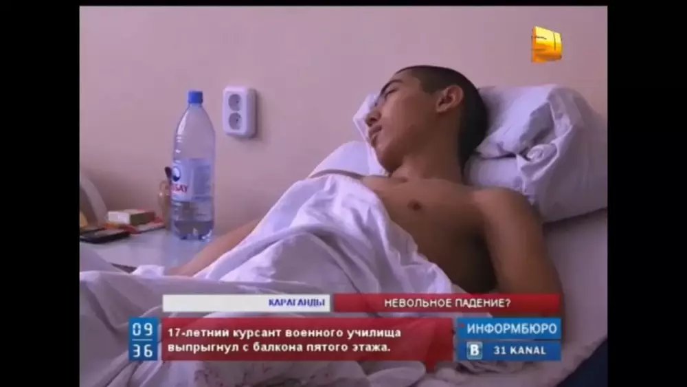 В Караганде 16-летний курсант военной школы-интерната упал с балкона пятого этажа, сообщают корреспонденты "Седьмого канала". Чингиз Аманкельдинов вместе с друзьями находился в гостях у командира взвода. После разговора он вышел на балкон, а позже его нашли лежащим на асфальте. По версии следствия, это была попытка суицида, однако родители юноши утверждают, что против их сына было совершено преступление. "Такого не может быть, чтоб суицид сделал. Не верю, конечно. Это обязательно подстроено. Его или вытолкнули, или заставили это сделать", - говорит отец Чингиза Аманбек Жасаров. На территорию интерната родителей парня не пускают. "Пока все не остыло, надо уже расследовать. Допрашивать этих, которые рядом были с ним. Почему он там, на квартире был, почему в казарму не запустили их. Почему командир взвода домой увез", - возмущается Жасаров. Родители написали заявление в прокуратуру. В Министерстве обороны заявили, что школа находится не в их ведомстве, а в Министерстве образования и науки. Сейчас Чингиза перевели из реанимации в отделение травматологии. У парня диагностировали тупую травму живота, разрыв брыжейки и перелом костей таза.