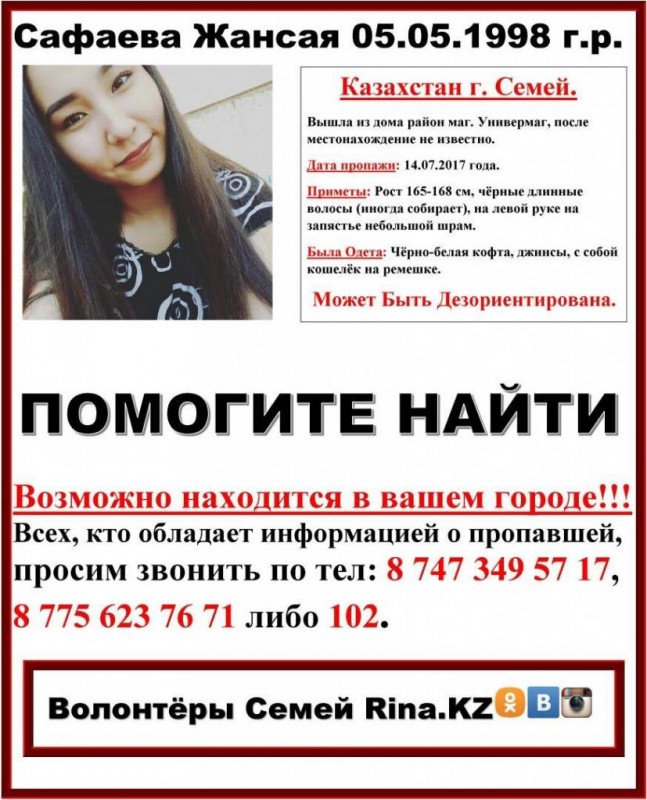 В день исчезновения Жансая была одета в черно-белую кофту, джинсы, при себе был кошелек на ремешке. Особые приметы: на запястье левой руки небольшой шрам. Семья девушки и волонтеры просят всех, кто владеет какой-либо информацией о ней, сообщить по телефонам: 8-747-349-57-17, 8-115-623-76-71 или 102.