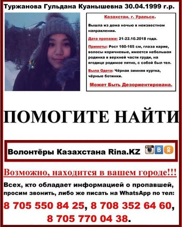Всех, кто что-либо знает о местонахождении Гульданы Туржановой, просим обратиться по номеру 102 или к маме девушки - Альбине по номеру: 8 777 569 10 88.