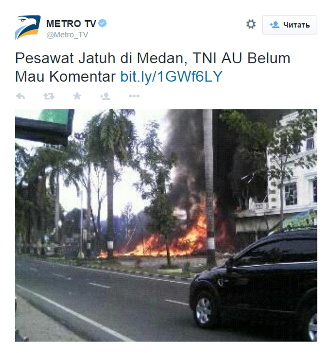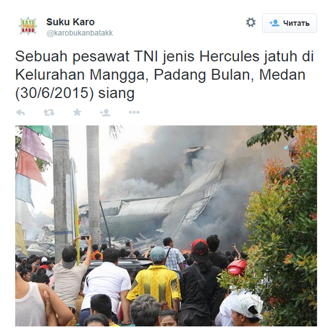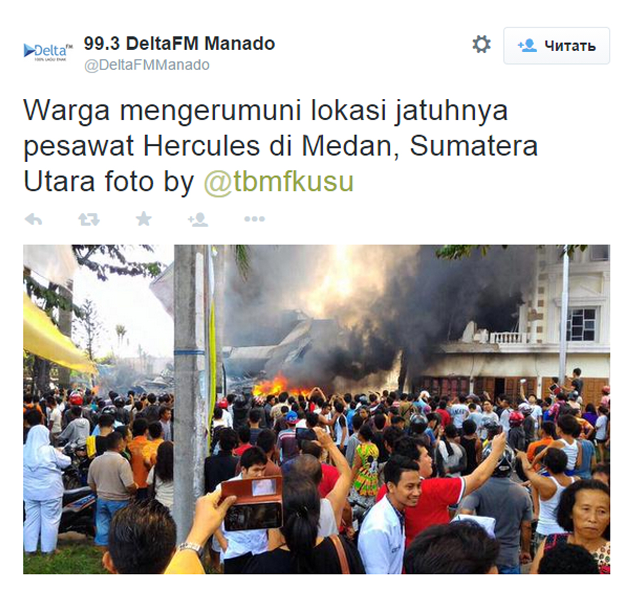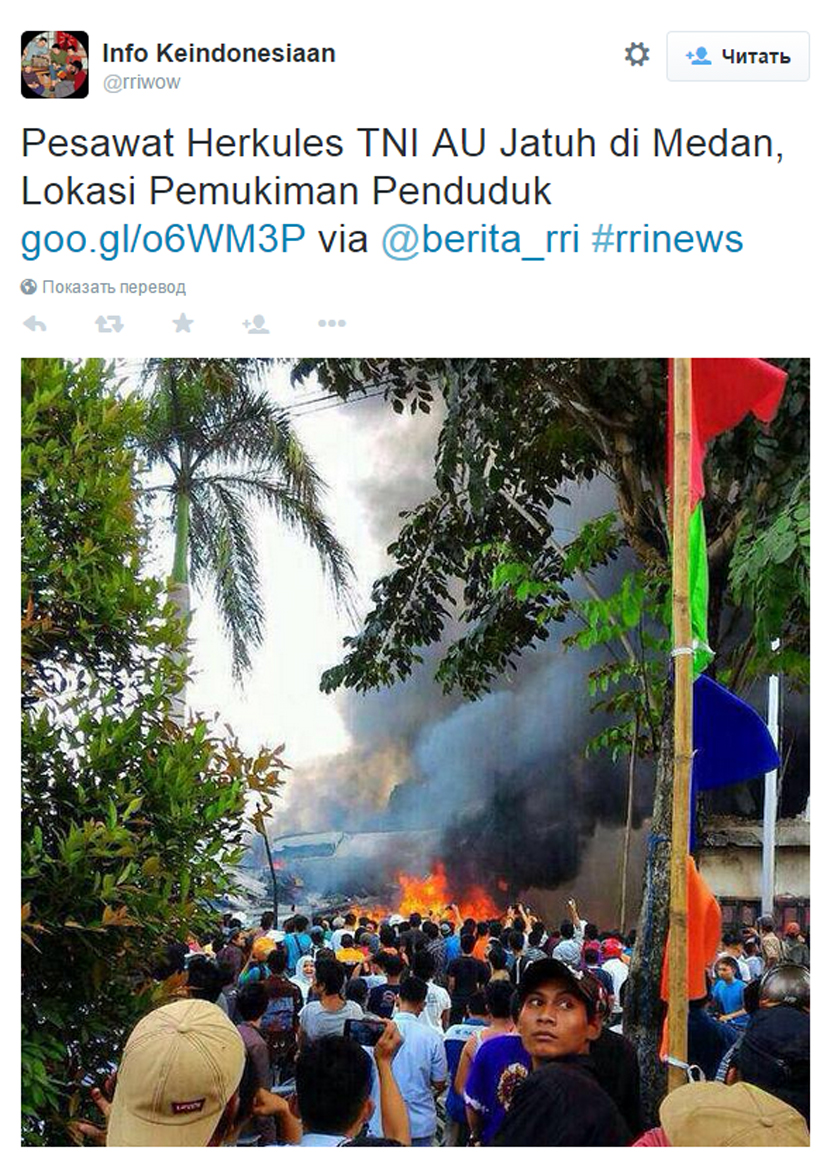 Известно, что самолет вылетел с индонезийской военной базы Медан и направлялся к острову Натуна. На данный момент сообщается о 30 погибших. "По последним данным, 30 человек погибли. Число погибших может возрасти", - заявил представитель спасательной службы Индонезии Хисара Турнипа. Сейчас на месте крушения самолета продолжается пожар, работают десятки спецмашин. Пострадавшие поступают в больницу имени Адама Малика (Adam Malik).