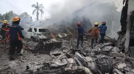Военно-транспортный самолет Hercules C-130 разбился в столице индонезийской провинции Северная Суматра, городе Медан, передает РИА Новости. Воздушный транспорт взорвался в воздухе, а затем его обломки упали на отель Golden Eleven, перед этим зацепив два здания.