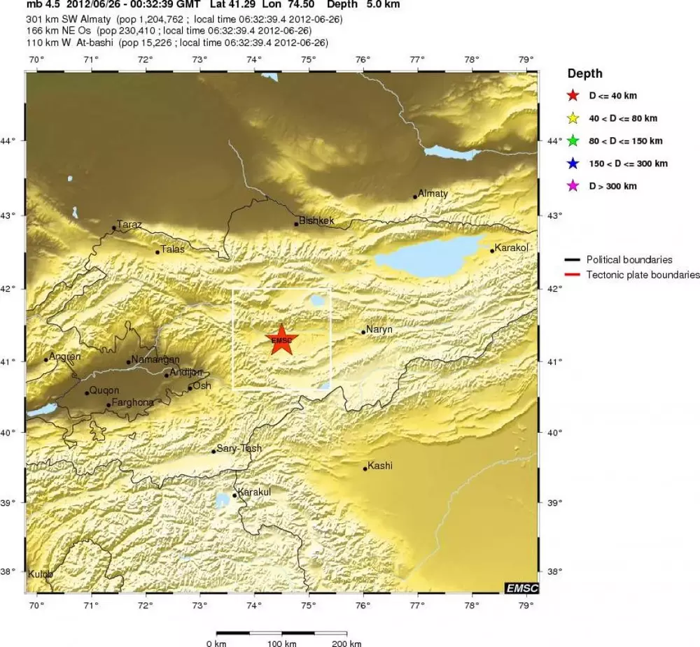 На территории Кыргызстана произошло землетрясение магнитудой 4,5, передает корреспондент Tengrinews.kz со ссылкой на Европейско-Средиземноморский сейсмологический центр. Подземные толчки были зафиксированы 26 июня в 06.32 по времени Астаны. Эпицентр землетрясения, глубина которого составила пять километров, находился в 301-м километре юго-западнее Алматы и в 166 километрах северо-восточнее кыргызского города Ош. Информации о жертвах и разрушениях нет. Напомним, как ранее сообщалось, 14 июня на территории Китая недалеко от границы Казахстана произошло землетрясение магнитудой 4,6. Эпицентр подземных толчков, глубина которых составила один километр, находился в 330 километрах южнее Алматы и в 198 километрах северо-восточнее китайского города Каши.