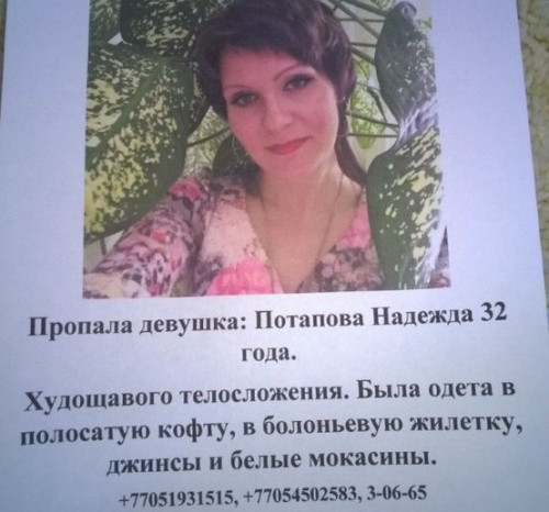 Потапова занимается бизнесом и работает в интернате педагогом. В последний раз женщину видели в районе заправки "Бахыт" 26 сентября в 20.30 вечера. По словам знакомого, подвозившего в тот вечер Надежду домой, у нее зазвонил телефон и она неожиданно попросила оставить ее именно на этом участке дороги. Сказала, что сейчас ее заберут. Знакомый предложил ей подождать ее, но она ответила: "Езжай".  И он уехал.
