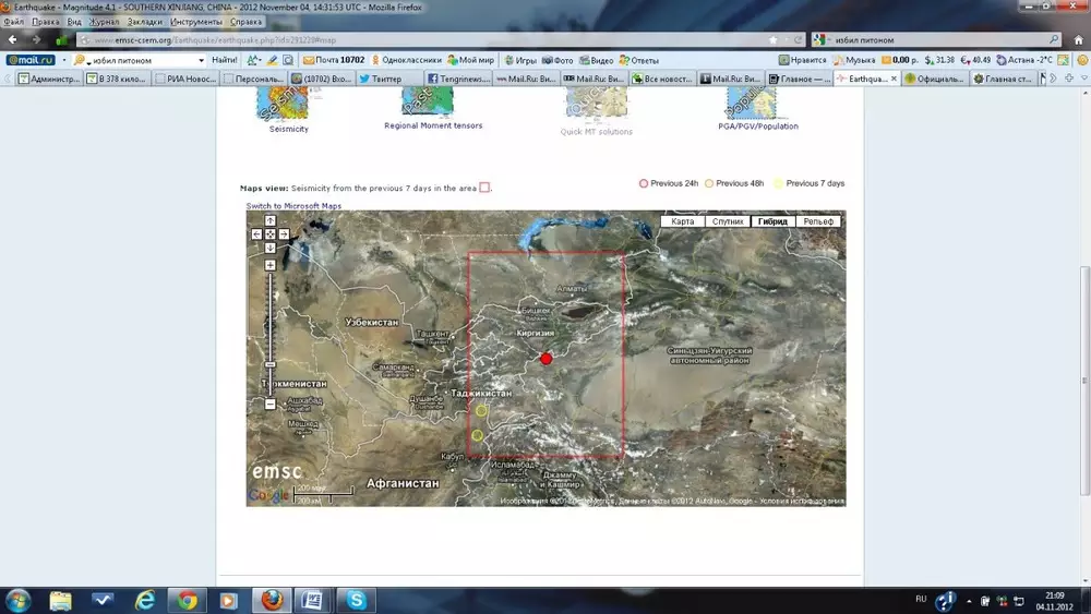 На территории Китая в 20.31 по времени Астаны произошло землетрясение магнитудой 4,1, передает корреспондент Tengrinews.kz со ссылкой на Европейско-Средиземноморский сейсмологический центр. Эпицентр подземных толчков зафиксирован на глубине 15 километров в 371 километре к юго-западу от Алматы, в 115 километрах к юго-западу от города Ат-Баши (Кыргызстан) и в 105 километрах к северо-западу от города Каши (Китай). Информации о жертвах и разрушениях нет. 26 октября в этом же районе произошло землетрясение магнитудой 4,5. Эпицентр землетрясения, глубина которого составила один километр, находился в 378 километрах южнее Алматы и в 127 километрах южнее Ат-Баши.