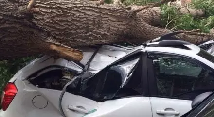 В Павлодаре поваленное ураганом дерево рухнуло на припаркованные автомобили, передает корреспондент Tengrinews.kz.