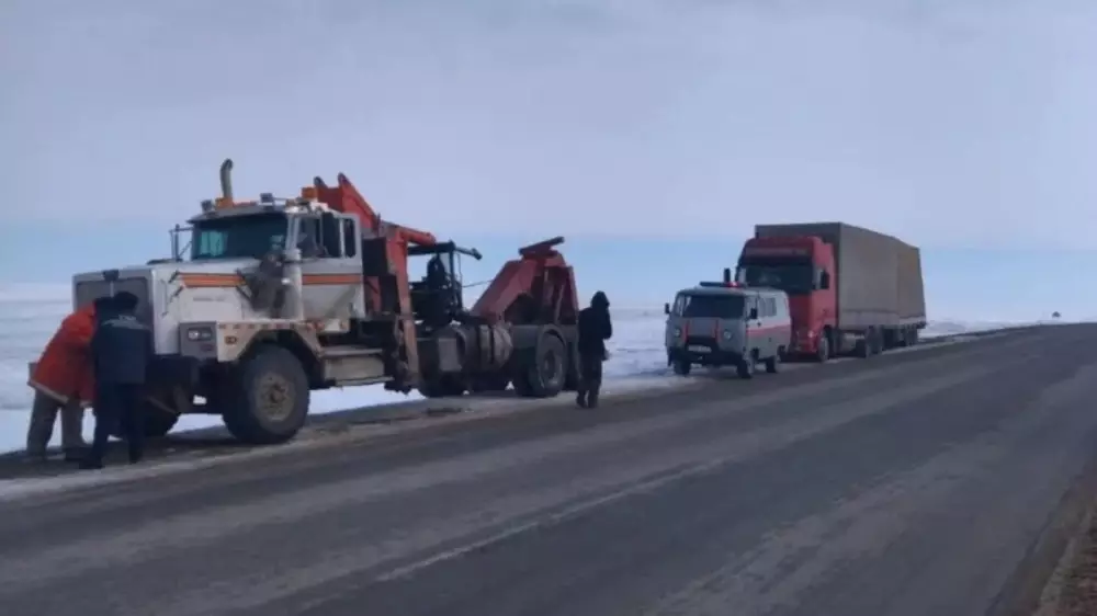 Прибывшие на место спасатели и представитель районного акимата с помощью специальной техники вывезли фуру на трассу.