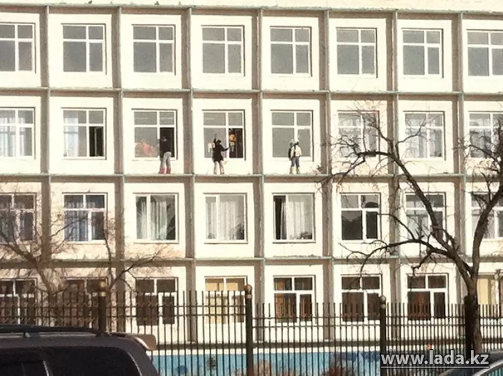 Шокирующие фотографии прислали читатели в редакцию сайта Lada.kz. На них изображены пятиклассницы, моющие окна, стоя на карнизе третьего этажа. Никакой страховки на детях не было. Все происходило в средней школе номер 5 города Актау.