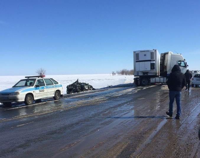 В Западно-Казахстанской области на трассе Самара - Шымкент столкнулись легковой автомобиль KIA и большегруз, передает корреспондент Tengrinews.kz.