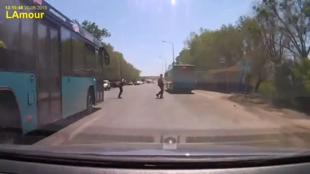 Автомобильный видеорегистратор запечатлел момент, когда двое мужчин переходили дорогу неподалеку от автобусной остановки. Один из пешеходов едва успел выскочить из-под колес автобуса, который даже не сбавил скорости. Уцелевший парень негодует.