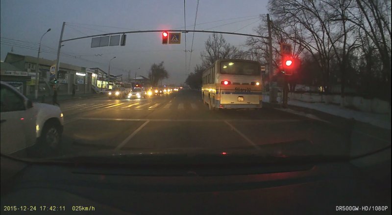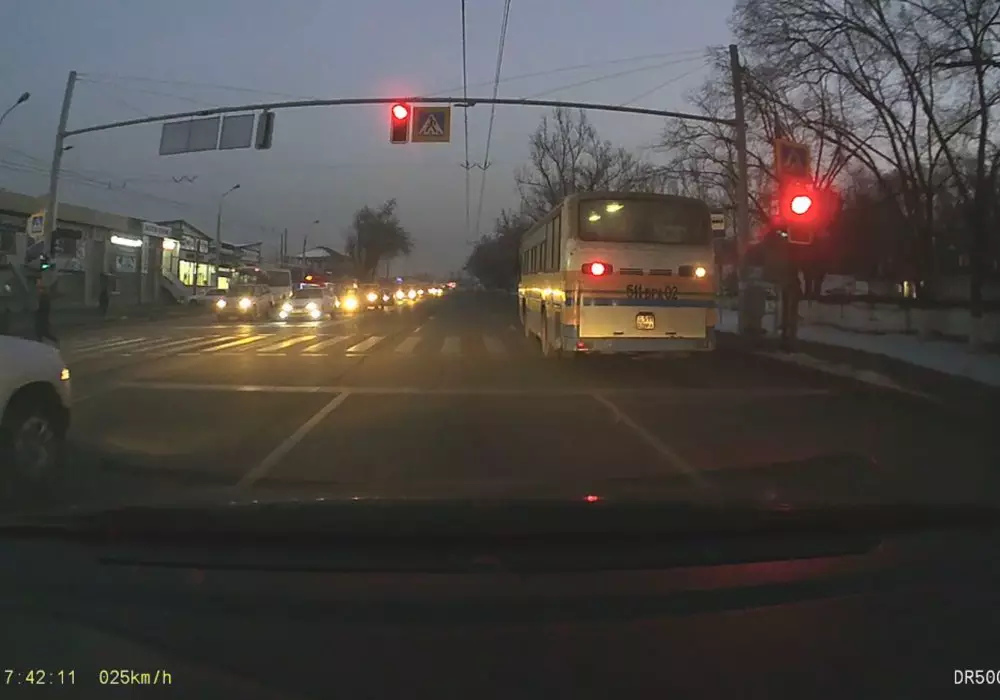 Запись предоставил редакции Ахмет Ахметов. По его информации, инцидент произошел 24 декабря 2015 года на улице Сатпаева. На видео запечатлено, как автобус выехал с заправки, а затем, проехав некоторое время по дороге, практически не сбавляя скорости, на красный сигнал светофора проехал регулируемый пешеходный переход. Автор видео отмечает, что в это время по переходу двигались люди и транспорт проехал на опасном расстоянии от них.