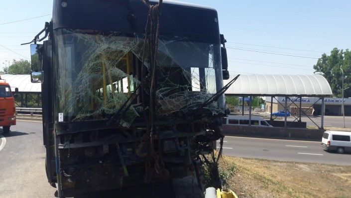 В Алматы автобус врезался в отбойник на мосту, сообщает корреспондент программы "Территория происшествий" на телеканале СТВ.