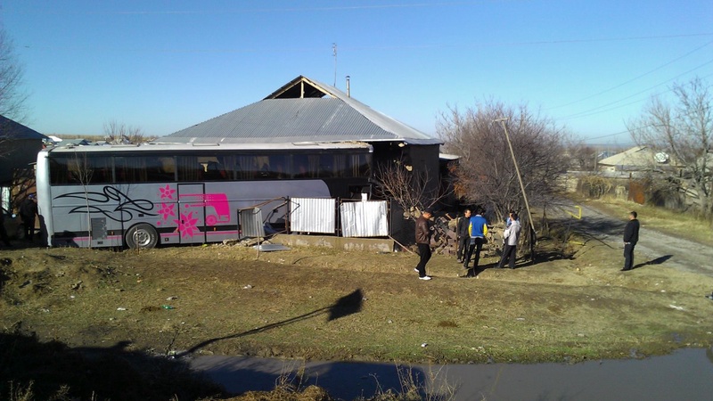 ДТП с участием автобуса произошло на 15-м километре трассы Кайтпас - Машат в селе Карасу. Автобус Vanhol, в салоне которого находились 32 пассажира, столкнулся с автомобилем Audi, после чего врезался в частный жилой дом. Автобус повредил стену и потолочное перекрытие на площади 20 квадратных метров.