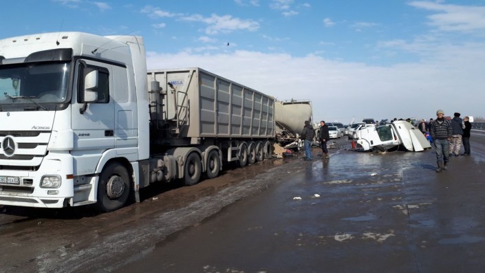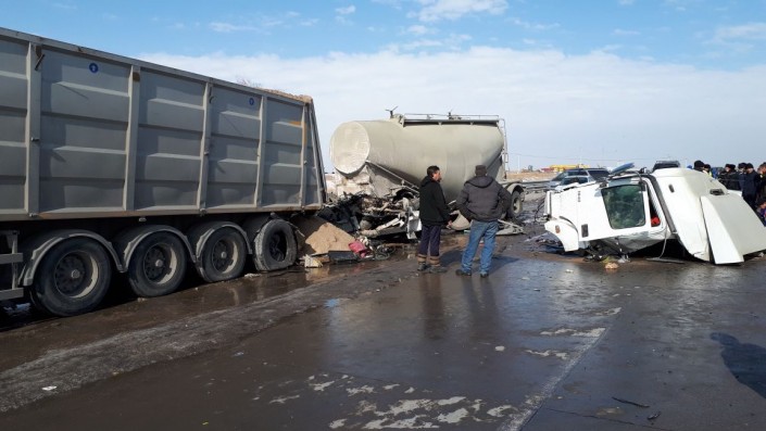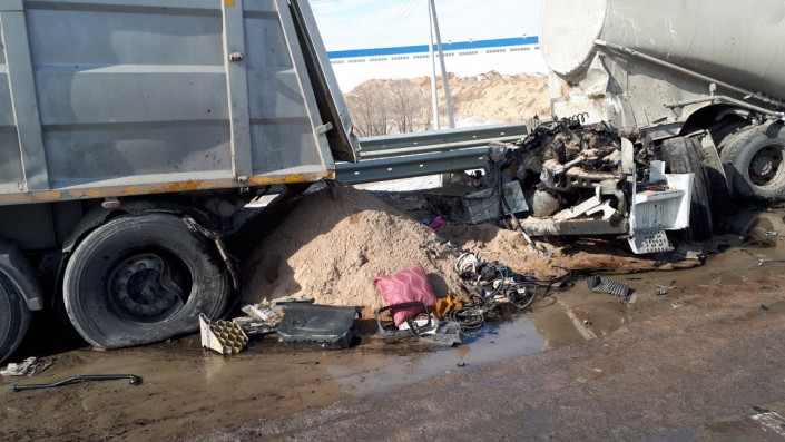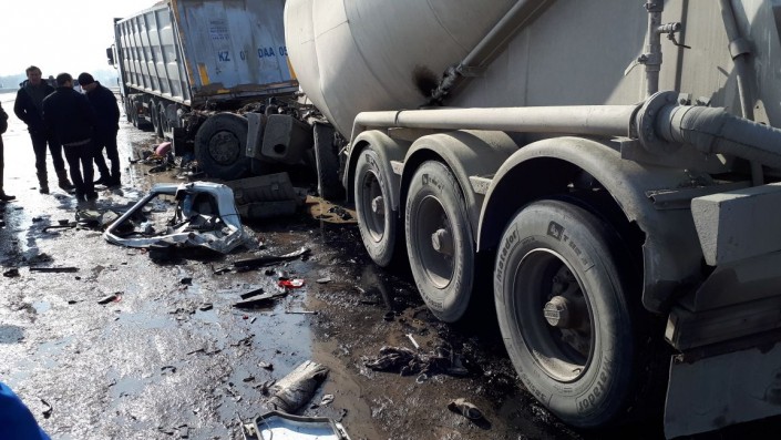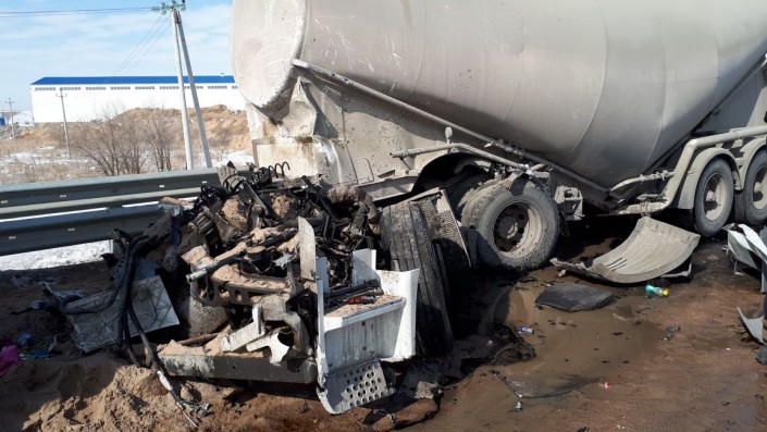 Грузовик-миксер с цементом, ехавший в сторону Алматы по трассе из Капшагая, на полном ходу врезался в припаркованную фуру, сообщает корреспондент программы "Территория происшествий" на телеканале СТВ.