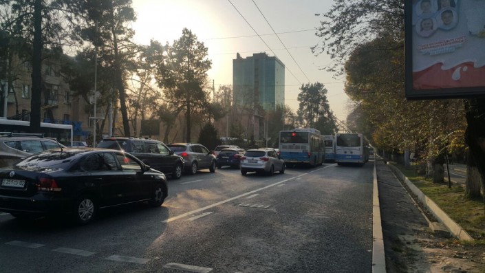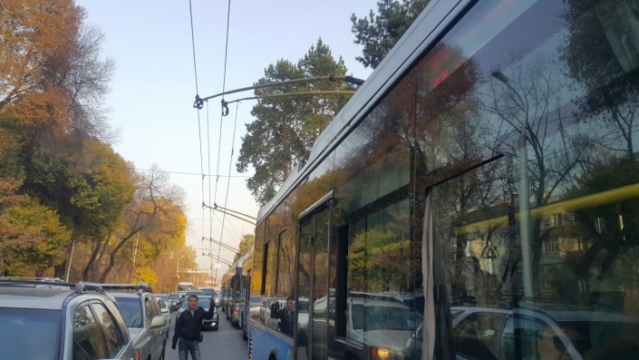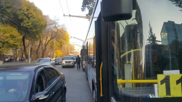 Корреспондент программы "Территория происшествий" на СТВ выяснил, что на Абая-Масанчи в пробке стояли три троллейбуса маршрута №9. Как рассказала пассажирка первого, они не трогались с места около 30 минут.
