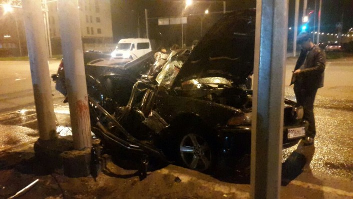 После удара о столб иномарка загорелась. Машина превратилась в груду металла и, судя по всему, восстановлению не подлежит.