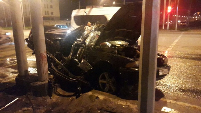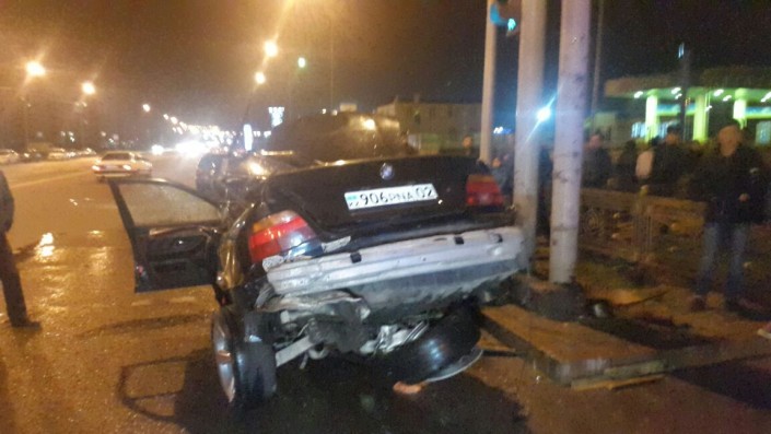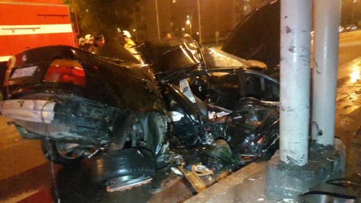 Автомобиль BMW, двигаясь на юг по Момышулы, на огромной скорости, не справившись с управлением, врезался в столб. В результате аварии пострадало три человека. Они были госпитализированы. Со слов очевидцев, у одного из травмированных оторвало ухо. Позже один из пострадавших скончался в больнице.