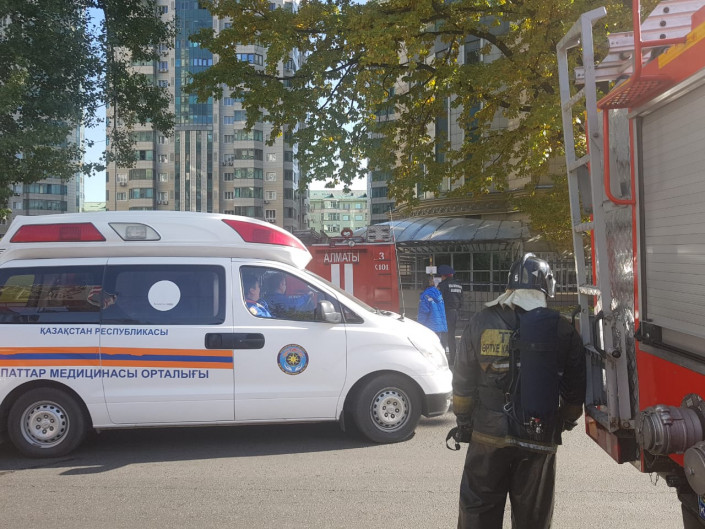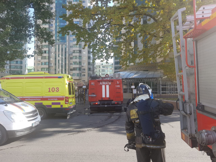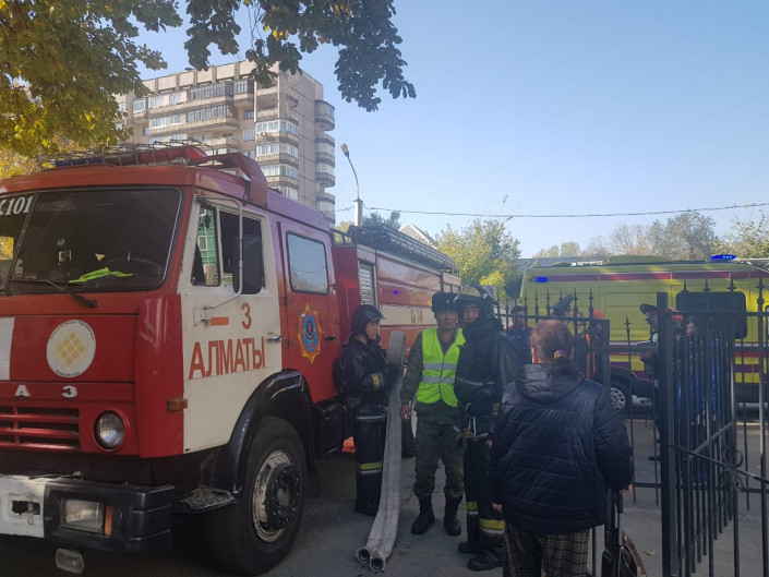 Позже в ДЧС проинформировали, что в 10.59 поступило сообщение от очевидцев о возгорании многоэтажного здания на пересечении улиц Шевченко и Муканова.