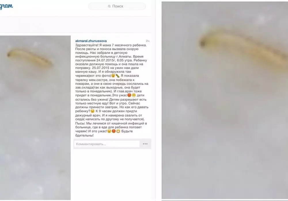 Инцидент произошел с мамой семимесячной девочки Акмарал Жунуссовой. 24 июля у ее ребенка случилось расстройство желудка, и она вызвала "скорую помощь". "Нас забрали в детскую инфекционную больницу Алматы. Время поступления - 24 июля 6.05 утра. Ребенку оказали должную помощь, и девочка пошла на поправку. На следующий день на ужин нам принесли манную кашу. И я обнаружила там червяка. Я показала тарелку медсестре, она побежала к поварам, а они в свою очередь сослались на заведующего склада", - написала на своей странице в Instagram Жунуссова.