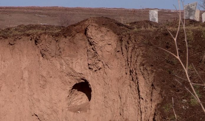 "Тогда зияли три дыры, могилы трех человек. Сейчас мы видим еще две. Это же ужас! Вон зияют дыры - даже кости видны. А на этой части откоса останки уже выпали из могилы. До сих пор не могу успокоиться. Кому только не говорил. Все знают, но никто не принимает мер. Поэтому пришлось мне обратиться в редакцию телекомпании "Отырар", - рассказал житель села Маятас.