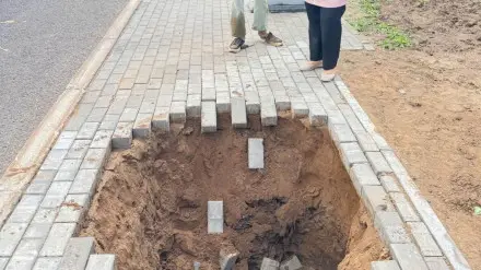 "Произошел локальный провал тротуарной плитки рядом с коллектором диаметром 1000 миллиметров. Образовалась яма, на дне которой находилась вода.