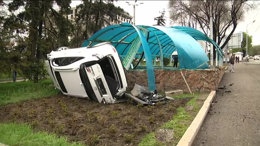 Инцидент произошел днем 26 апреля. Кроссовер Lexus двигался в восточном направлении по проспекту Абая. В иномарке находились две девушки. На пересечении с проспектом Достык, водитель не справилась с управлением и вылетела на пешеходный тротуар. Автомобиль перелетел через ограждения и  врезался в бетонный парапет подземного перехода.