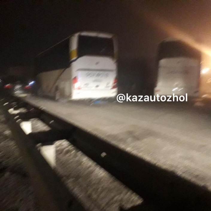 Тем временем два пассажирских автобуса друг за другом направлялись из Тараза в Алматы. Водитель первого автобуса, заметив ДТП, начал тормозить и врезался в боковую часть КамАЗа. Второй же автобус, не соблюдая дистанцию, въехал в первый автобус.
