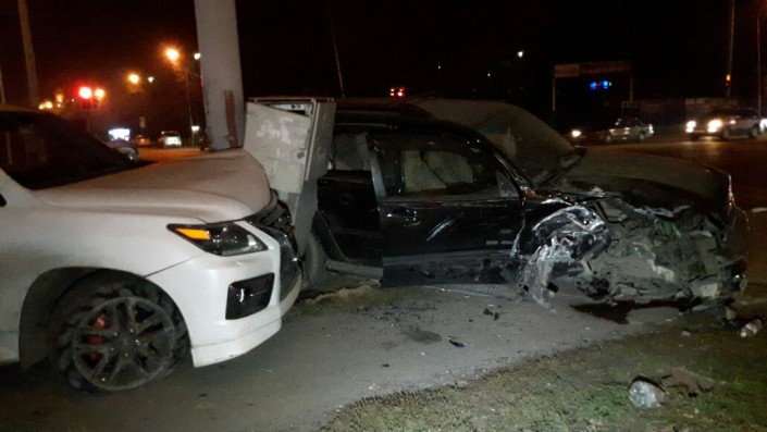 По другой версии, Lexus собирался поворачивать с Толе би на Яссауи, однако в него на полном ходу врезалась Toyota 4Runner.