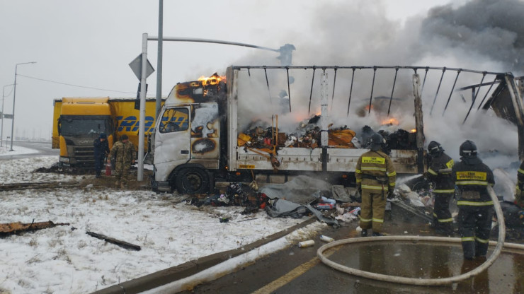"В результате дорожно-транспортного происшествия произошло возгорание сгораемых частей двух грузовых автомобилей Scania и Volvo на общей площади 60 квадратных метров", - сообщили корреспонденту Tengrinews.kz в областном департаменте по ЧС.