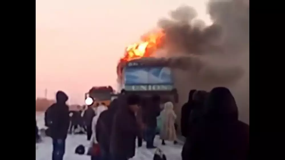 В нескольких километрах от Астаны на трассе полностью сгорел двухэтажный пассажирский автобус, следовавший в столицу из Усть-Каменогорска. Один из пассажиров злополучного рейса записал инцидент на видеокамеру и вложил на портал YouTube.