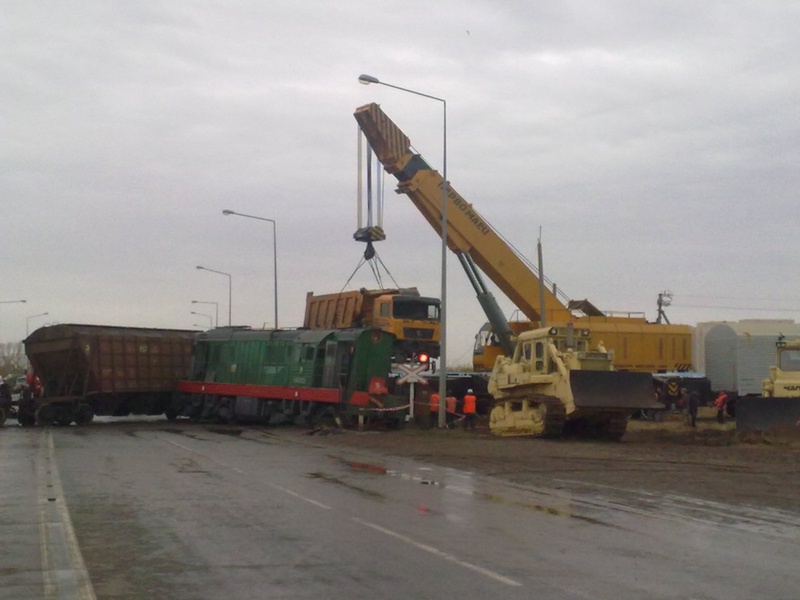 В результате ДТП произошел сход трех вагонов груженных зерном, с различными травмами госпитализирован в больницу водитель КамАЗа.