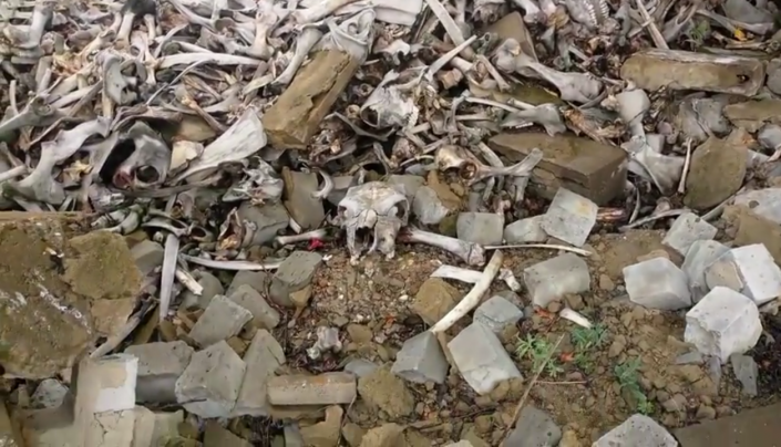 Груды останков находятся на территории одного из заброшенных предприятий в промышленной зоне Павлодара. Кости животных разбросаны рядом с полуразрушенными производственными корпусами, навалены вдоль бетонного ограждения.