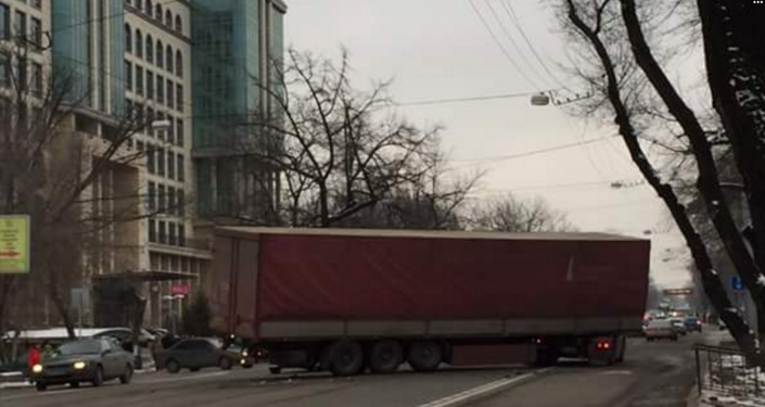 По неясной пока причине грузовик с прицепом встал поперек дороги в районе пересечения с улицей Шарипова, тем самым полностью парализовав движение. Полиция закрыла проезд в обе стороны.