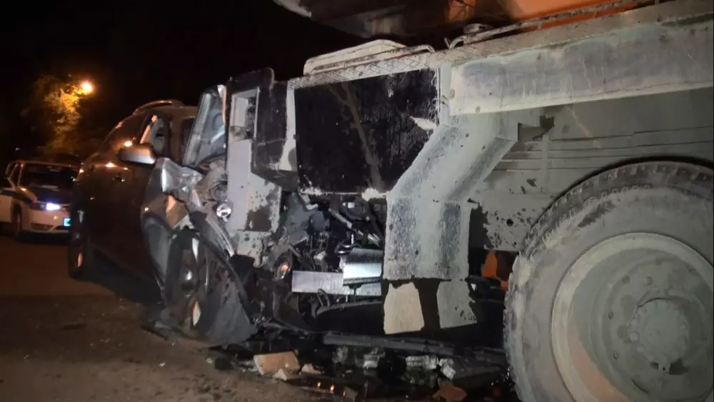 Infiniti влетел в автокран в Алматы Фото ©"Территория происшествий"