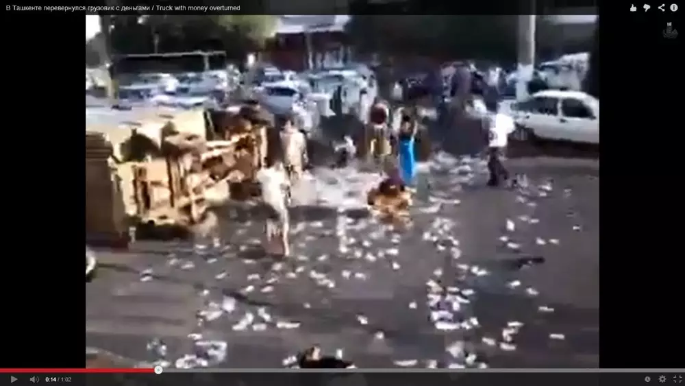 В результате инцидента никто не пострадал. Сбор купюр у перевернутой инкассаторской машины сняли на видео и выложили в Интернет.