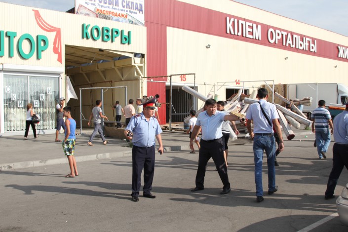 По информации корреспондента, предположительно, горят склады с обувью. Местные торговцы спешно выносят товар из уцелевших складов. На место также прибыли солдаты Нацгвардии.