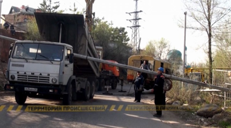 ДТП произошло в Алмаарасанском ущелье по улице Навои выше экологического поста днем 10 апреля. Водитель КамАЗа выгрузил песочные смеси на стройке и, забыв опустить свой кузов, поехал вниз по улице. На участке, где газовая труба пересекала сверху улицу, кузов КамАЗа задел трубу и сорвал металлическую конструкцию.