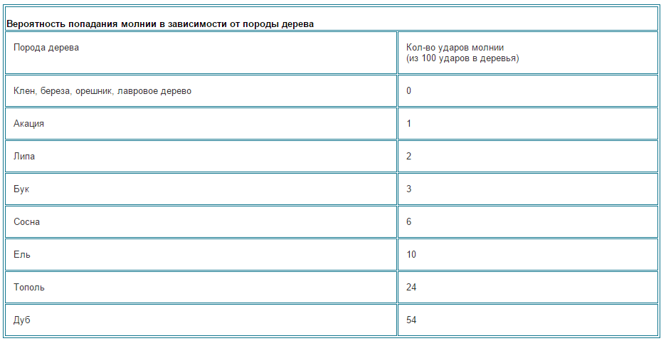 Вероятность попадания молнии в конкретное дерево прямо пропорциональна его высоте. В связи с этим в департаменте даже приводят специальную таблицу.